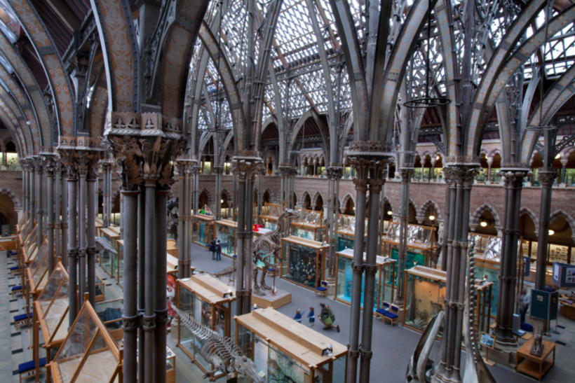 - Естественнонаучный музей Оксфорда (Oxford University Museum of Natural History) предлагает посмотреть на археологические находки, а также кости и чучела многочисленных животных. Особое внимание здесь привлекают динозавры: их огромные скелеты удивительно органично вписываются в интерьеры огромного центрального зала, напоминающего не то собор, не то ангар: металлические балки на потолке отлично сочетаются с резными верхушками колонн и арочными галереями красного кирпича в барочном стиле, тянущимися по периметру. Оценить вид можно на виртуальной панораме музея. Даже если вы не слишком интересуетесь археологией и естественными науками, заглянуть сюда стоит ради эстетического удовольствия. Добавлю, что этот музей во многом похож на Естественнонаучный музей в Лондоне, о котором можно почитать здесь. Вход сюда бесплатный, музей работает без выходных с 10:00 до 17:00. Больше информации ищите на сайте.
