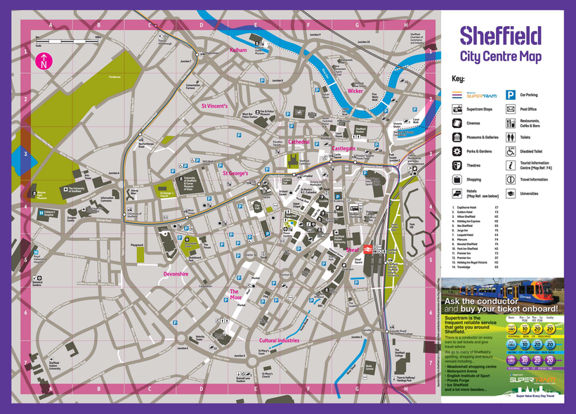 - (1) Ближайшие к станции отели Novotel Sheffield Centre (адрес: 50 Arundel Gate) и Jurys Inn Sheffield (адрес: 119 Eyre Street), средняя цена двухместного номера начинается от 80 USD за ночь. Немного подальше, но ближе к центру располагается Mercure Sheffield St Paul's Hotel & Spa (адрес: 119 Norfolk Street), цены начинаются от 100 USD. Если бронировать отели заранее, за 2-3 месяца (учитывая сезон), то можно поймать хорошее предложение в районе 20 USD в этом районе