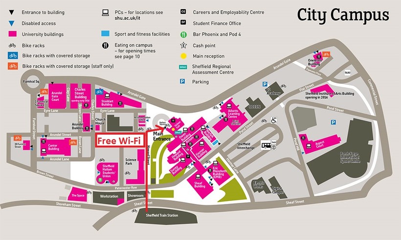 Также могу посоветовать место с бесплатным Wi-Fi по приезде в Шеффилд, если вам нужно будет выйти в интернет прежде, чем идти в отель, — главный кампус Sheffield Hallam University, его сложно пропустить. Туда можно свободно пройти и подключиться к интернету «что-то там GUEST» и заодно посмотреть университет.