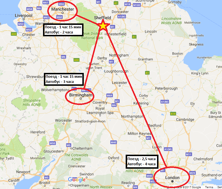 Поезд идет примерно 2-2,5 часа и привозит вас на ж/д станцию Sheffield.