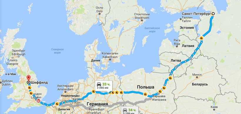 - Если верить онлайн картам, расстояние от Москвы до Шеффилда 3158 км, из Санкт-Петербурга, по каким-то причинам, проложенный путь составляет 3066 км.