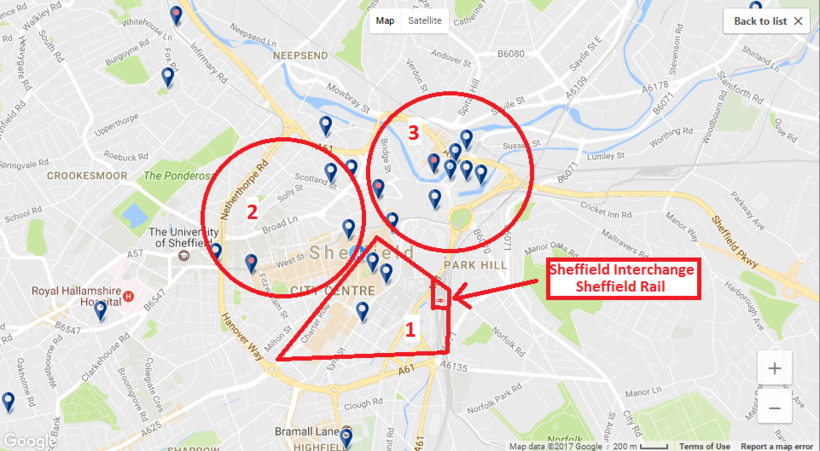- (2) Довольно динамичный район, где находятся основные бары и клубы Шеффилда. Если вы путешествуете с детьми, то этот вариант, возможно, не самый лучший, так как там может быть шумно и там находятся основные студенческие общежития. Однако, если вам как раз-таки хочется влиться в толпу, то там все веселье. В этом районе мало отелей, в основном апартаменты от 80 USD за ночь. Рекомендую посмотреть airbnb.co.uk, там можно найти апартаменты от 25 USD.