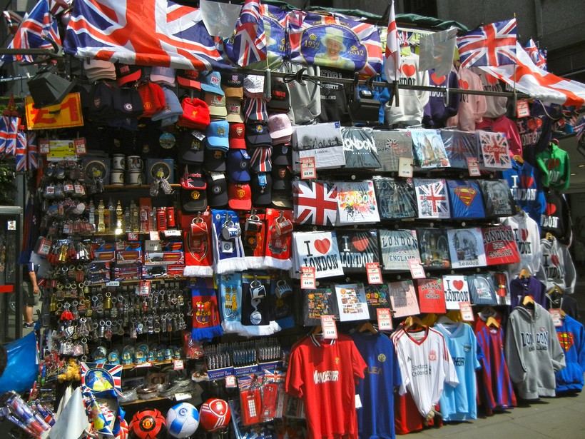 Небольшие киоски с магнитами от 3,5 EUR (3 GBP), кружками от 5,8 EUR (5 GBP) и подушками с флагом Union Jack от 17,6 EUR (15 GBP) есть на всех центральных улицах Лондона. Сине-красные патриотичные цвета вывесок бросятся вам в глаза. Владельцы, как правило, индусы, а в ассортименте полно рюкзаков, чемоданов, чашек и всяческой мелочевки стоимостью от пары фунтов стерлингов и до 58 EUR (50 GBP).