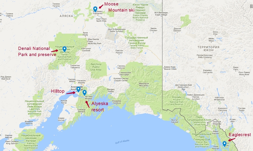 Для любителей зимнего активного отдыха на Аляске находится множество горнолыжных курортов. Самые знаменитые — это Alyeska resort в городе Гердвуд, Moose Mountain Ski Resort в Фэрбанксе, Eaglecrest в Джуно, Hilltop в Анкоридже и, конечно, знаменитый Национальный парк Денали.