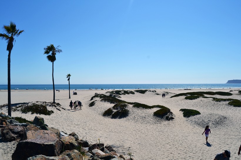 Пляж находится как бы в заливе, поэтому большие волны сюда не приходят. Кстати недалеко от Сан Диего. Рядом с пляжем есть длинный променад, а также много ресторанов, кафе и известный отель Hotel Del Coronado.