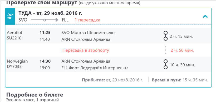 Составляя маршрут и подыскивая билеты, я выбрала для меня наиболее простой и более дешевый способ, а именно перелёт с пересадкой из Москвы (аэропорт Шереметьево) до Форт-Лодердейла (аэропорт Fort Lauderdale-Hollywood International).