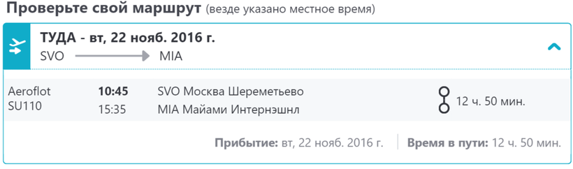Для тех, кто боится и не любит пересадкок, тот же «Аэрофлот» предлагает прямой рейс с Москвы до Майями за 12 часов 50 минут. Рейсы летают из Москвы примерно три раза в неделю. Однако такое удовольствие обойдется в цену от 568 USD (36 тысяч рублей), а времени почти не сэкономит.