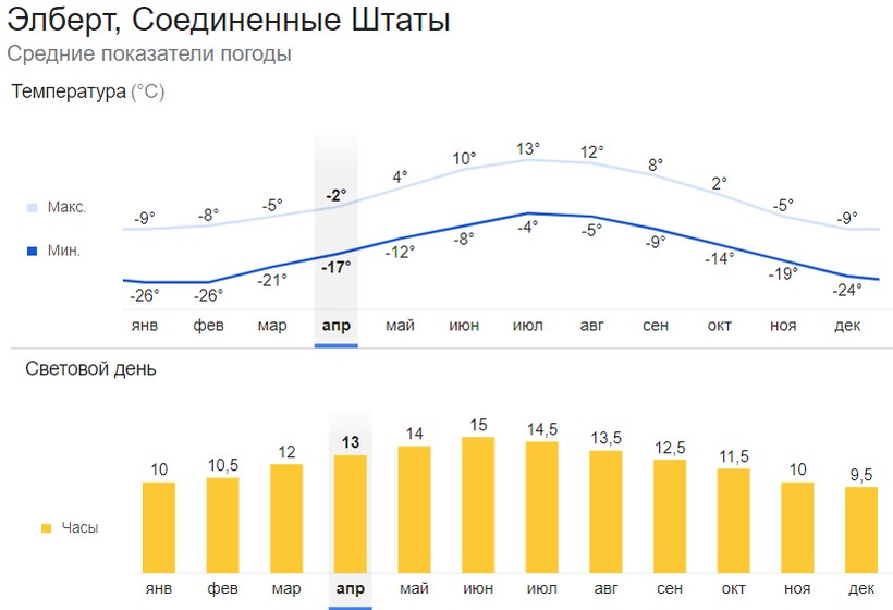 Для Эльберта характерен континентальный субарктический климат. Значения температуры воздуха зависят не только от времени года, но и высоты. Даже в летнее время на вершине можно увидеть снег и лед.