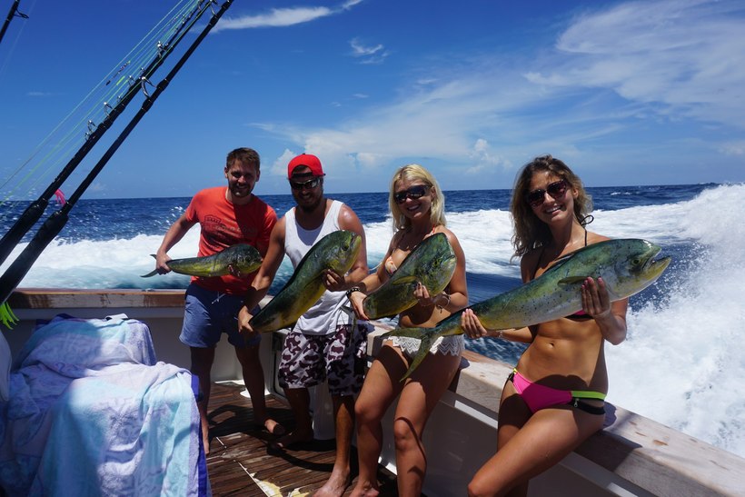Отдельно стоит отметить рыбалку в открытом океане. Вы можете отправиться и на своей лодке/яхте, если уверены в себе и знаете маршрут. А можете арендовать, что, конечно, будет гораздо затратнее, ведь платить придется не только за горючее, снаряжение, но и персоналу, который отправится с вами (обычно 1 или 2 человека).Такая вылазка в открытый океан может стоить порядка 1000 USD за день. Но вы получите незабываемое удовольствие. Мы с друзьями остались очень довольны. Снизу на фото немного из нашего улова и наши счастливые лица.Кстати, имейте в виду, что на волнах очень сильно укачивает. И если вы когда-нибудь страдали этим недугом, то позаботьтесь заранее о своем здоровье — примите соответствующие лекарства перед поездкой. Иначе, рискуете проваляться всю рыбалку в каюте.