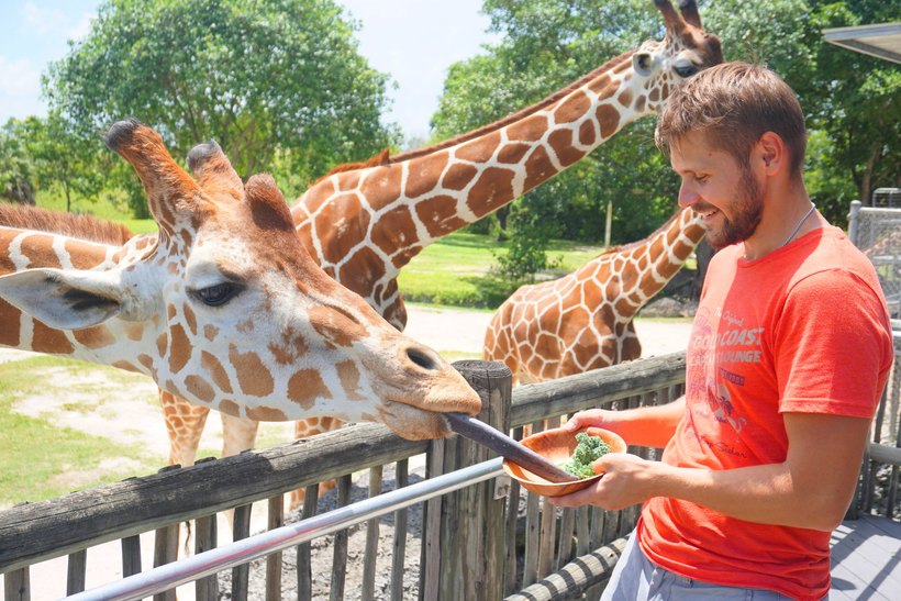 Многих животных можно увидеть в шаговой доступности, а некоторых даже потрогать и покормить. Что я и делаю на фото ниже. Зоопарк открыт с 10 утра до 17 вечера. Контактные данные: 12400 SW 152nd St, Miami, FL 33177, официальный сайт, телефон +1 305-251-0400. Стоимость билет для взрослого составляет 21.95 USD, для ребенка (от 3-х до 12-и лет) — 17.95 USD. Детям до 3 лет вход бесплатный.