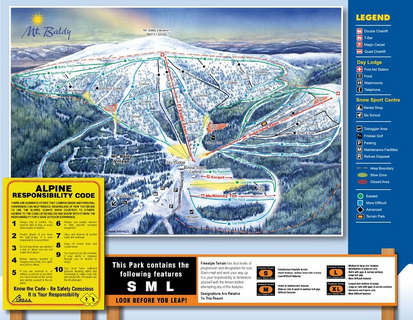 На курорте Mt Baldy 26 трасс, 4 из которых для новичков, 8 — для спортсменов среднего уровня и 14 — для профессионалов. На склонах работает 4 подъемника.