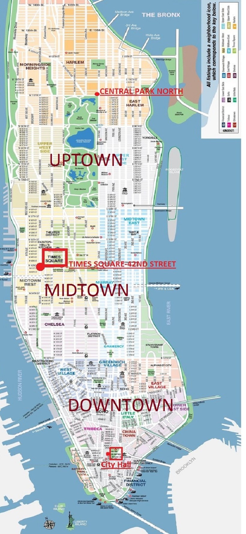В Центральном Манхэттене или Мидтауне (от 14-й улицы до 72-й улицы) и Верхнем Манхэттене или Аптауне (севернее 72-й улицы) расположились все самые основные достопримечательности Нью-Йорка, регулярно занимающие места в рейтингах самых посещаемых мест Америки и Нью-Йорка. Это делает Мидтаун культурным центром города. Все эти названия на слуху: