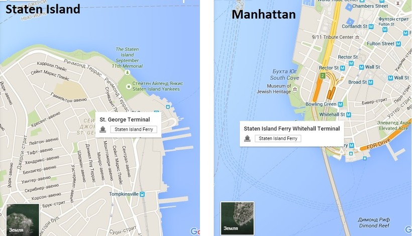 - Паром Статен-Айленд (Staten Island Ferry) — единственный путь, которым можно добраться до Статен-Айленда напрямую с Манхэттена. У этого пути столько плюсов! Во-первых, это бесплатно. Во-вторых, паром курсирует круглосуточно без выходных. В-третьих, он проплывает мимо Статуи Свободы. Я долго гадала, ехать ли мне на Статен-Айленд паромом или по мосту Верразано, и поступила очень просто: туда я отправилась по воде, а обратно автобусом. Итак, с Манхэттена паром отправляется от Статен-Айленд Ферри Уайтхолл Тёрминал (Staten Island Ferry Whitehall Terminal, южная окраина острова, Бэттери Парк, станция метро South Ferry), а на Статен-Айленд причаливает к Сент-Джордж Ферри Тёрминал (Saint George Ferry Terminal). Интервалы движения можно уточнить здесь.