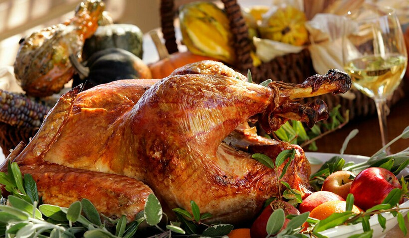 - запеченную индейку с гарниром — брюссельской капустой, картофелем или бобами;
