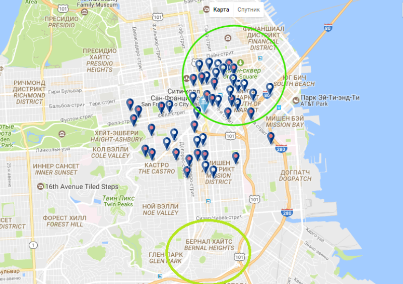- Район SOMA. Вверху, на скриншоте, я обозначила район SOMA, что означает South of Market. Market street — самая популярная улица в СФ, её можно считать центром города. В этом районе недешевая рента, но с другой стороны очень удобно расположены и достопримечательности, и маршруты общественного транспорта. Также здесь огромное количество вариантов жилья. В этом районе собирается очень много молодежи, район считается богемным. Здесь огромное количество баров и заведений с каким угодно форматом. Цена за ночь в хостеле или в отеле может быть разной. Как обычно раннее бронирование сбережет ваши деньги, а также, если вы будете постоянно мониторить предложения жилья в СФ, то можете попасть на очень удачную скидку или кратковременную акцию. Минимальная стоимость размещения на одного человека, которую мне удалось найти в этом районе, около 3 000 RUB, ну и до бесконечности. Но опять же, за эти небольшие деньги не рассчитываете на «царские условия» — придётся поджаться:) Но это ничего, главное, что вы в СФ! Кстати, в кое-каких хостел даже включен завтрак.