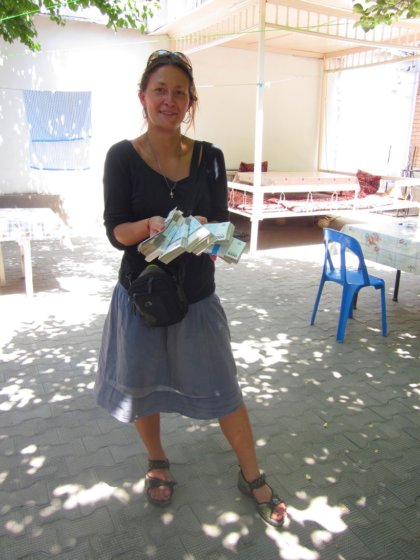 Сложность ситуации в том, что наибольшая купюра – 5000 сум, но менялы не спешат с ними расставаться и стараются расплатиться 1000-ными, а, значит, в обмен на несколько сотен долларов вас ждут увесистые пачки денег. Я даже часто шутила: