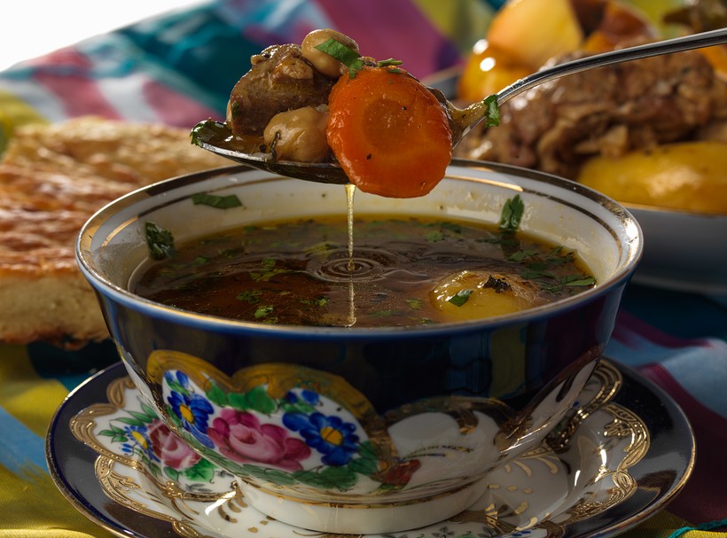 Важная составляющая этого аппетитного и сытного блюда – бульон, в который помимо традиционной жирной баранины добавляют курицу или говядину. Вторая составляющая удачной шурпы – овощи. Это и сочные томаты, и нетипичная для супа репка, и пикантный кайенский перец. Густоту супу добавляют бобы и фасоль, а необычный и узнаваемый вкус достигается сочетанием лука, чеснока, зиры, кориандра, шафрана и куркумы.