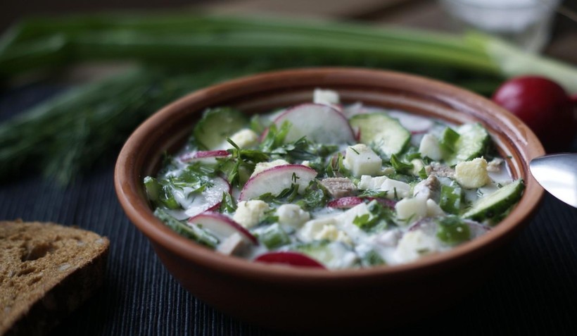 Настоящий чалоп готовится из простокваши, свежих огурцов, редиски и зеленого лука. Легкую пикантность супу добавляют перец, кинза и другие специи на выбор повара.