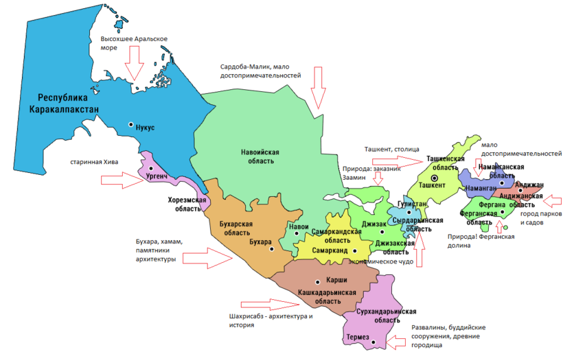 Теперь я хочу немного рассказать о регионах, на которые можно разделить Узбекистан.