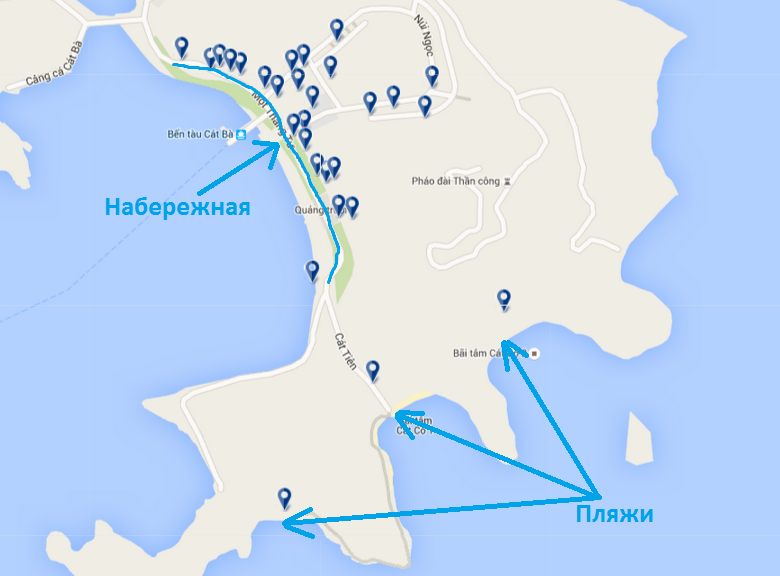 Вся туристическая инфраструктура острова сосредоточена в одной части острова - вдоль набережной. Здесь расположены практически все отели и рестораны, туристические агентства, магазины, центральный пирс, небольшой рынок и оба банкомата (их всего два на острове, так что лучше, на всякий случай, предварительно запастись наличными). Сюда же приходят автобусы с приезжающими из Ханоя, Хайфона и Халонга туристами.